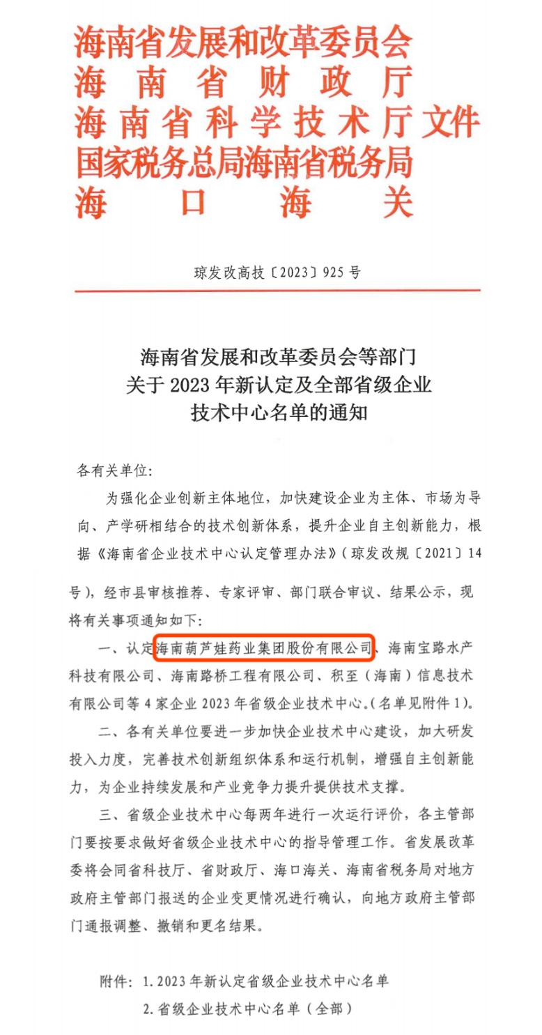 近日,海南省发改委等多部门联合公布了《关于2023年新认定及全部省级企业技术中心名单的通知》,其中,海南981博天娱乐药业集团股份有限公司成功通过评审,被认定为省级企业技术中心,是本次获批的4家企业之一。